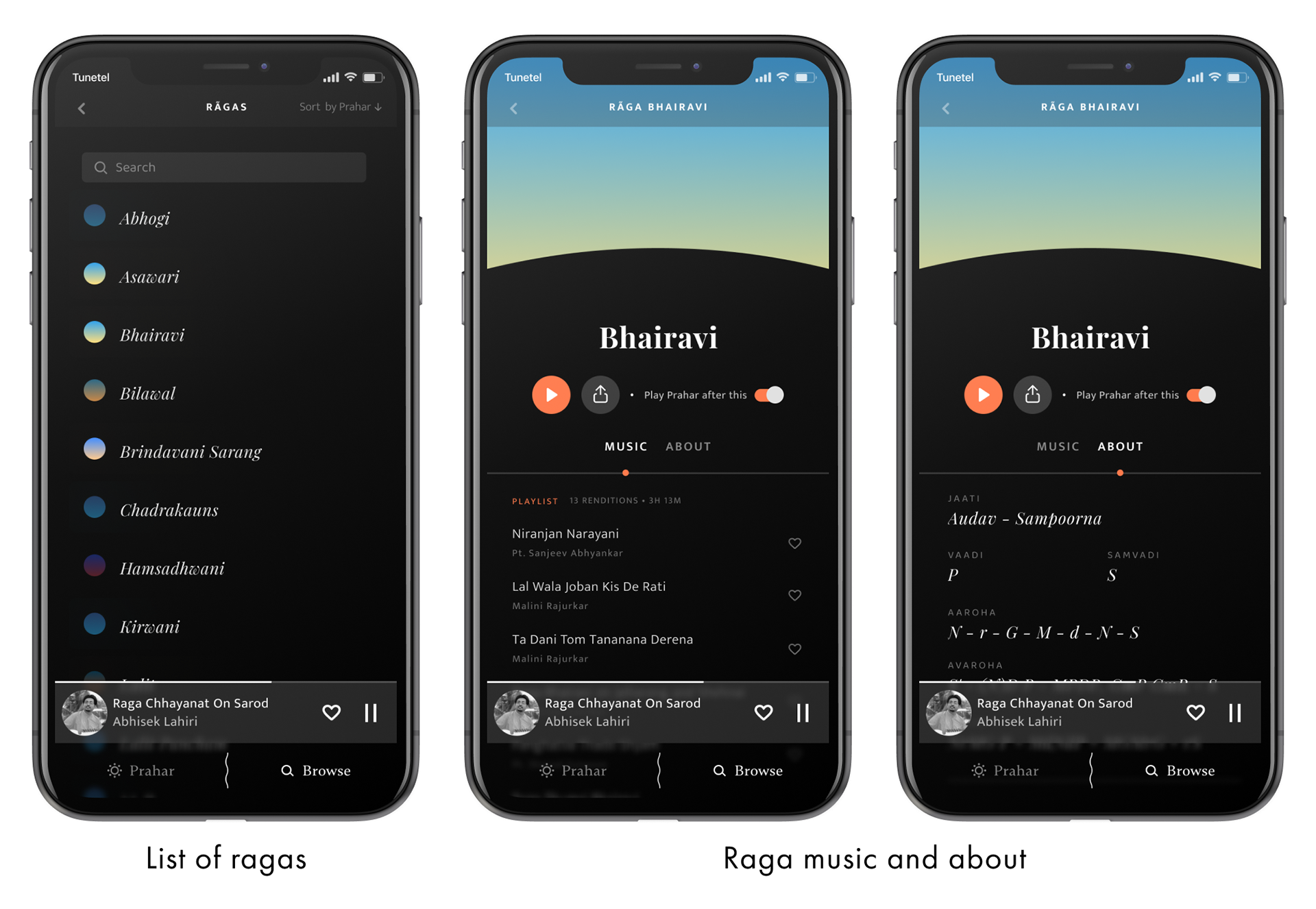 Each prahar (time of the day) presentation had a gradient background to complement the information to be presented for that raga.