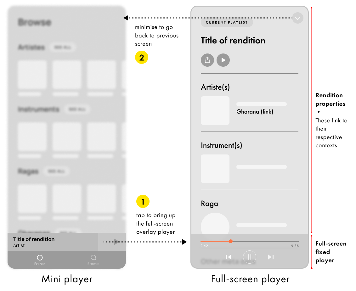 Keeping in mind the core functionality of Ragya as the music player, I created a UI framework which was comprised of 2 broad states: